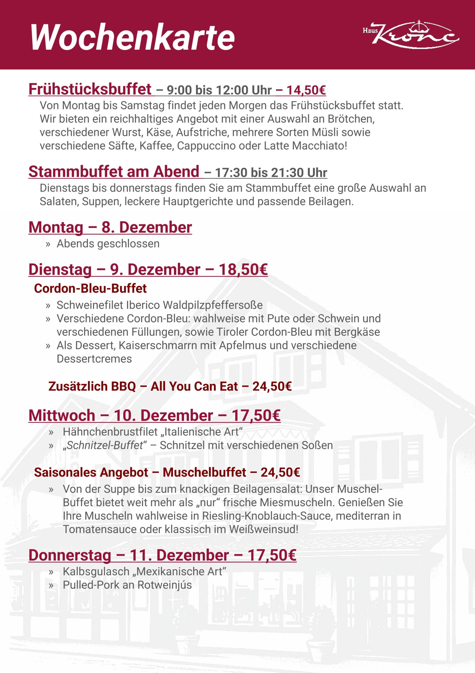 Für unsere Restaurantgäste ist unser Frühstücksbüffet von Montag bis Samstag von 9:00 Uhr bis 12:00 Uhr geöffnet (außer an Feiertagen).