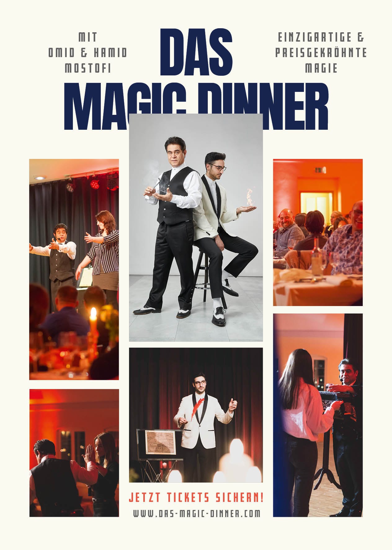 Tauchen Sie ein in eine moderne Show mit unseren besten Kunststücken der letzten Jahre, die Sie mitnimmt auf ihrer Reise durch die faszinierende Welt der Magie und für uns am wichtigsten, Sie in den Mittelpunkt der Show stellt. Die Zuschauenden sind Teil der Show, erleben die Magie in ihren eigenen Händen und entdecken sogar ihre eigene magische Seite. Ein Abend voller Magie, Genuss und unvergesslicher Momente erwartet Sie beim Magic Dinner.