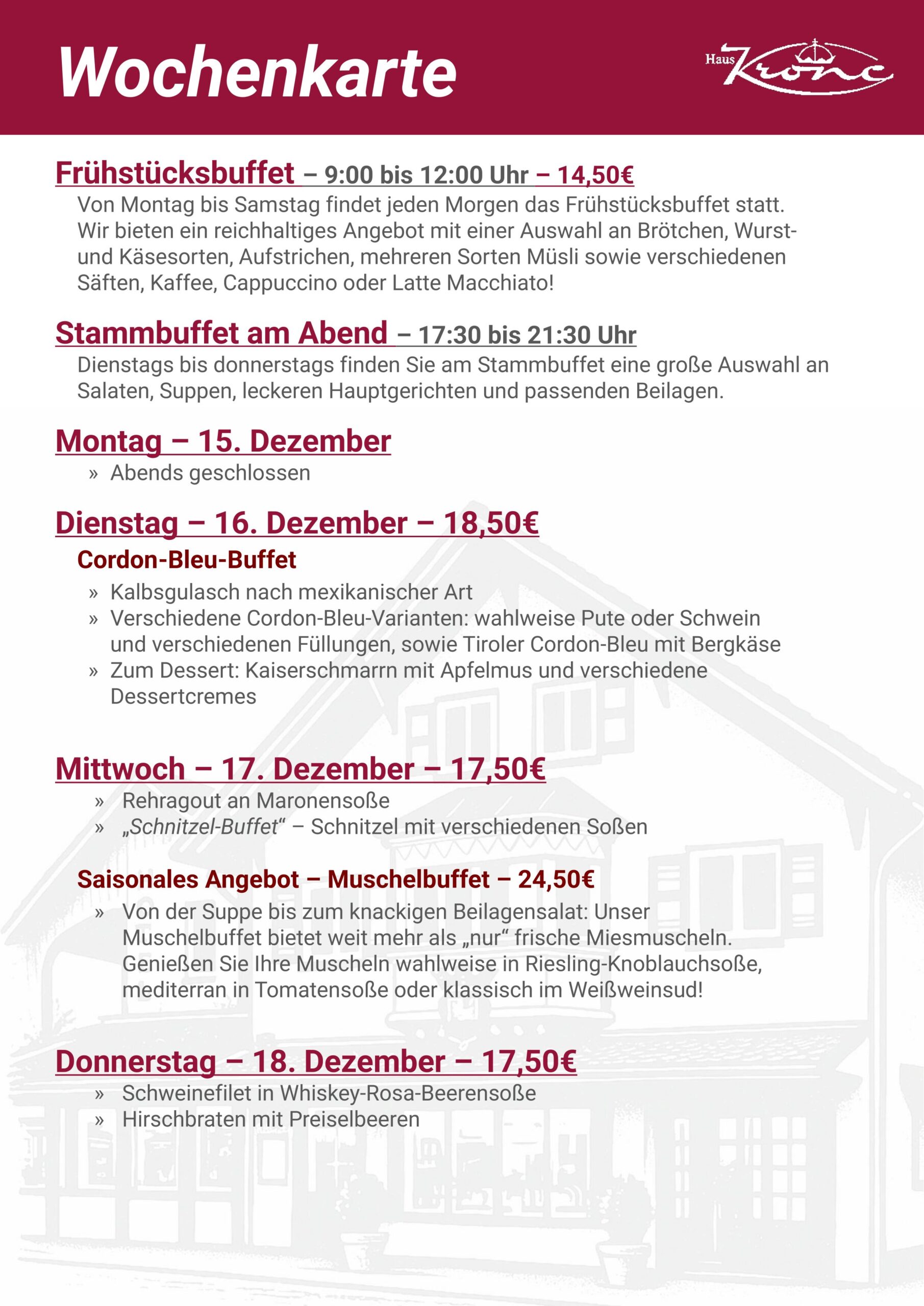 Für unsere Restaurantgäste ist unser Frühstücksbüffet von Montag bis Samstag von 9:00 Uhr bis 12:00 Uhr geöffnet (außer an Feiertagen).